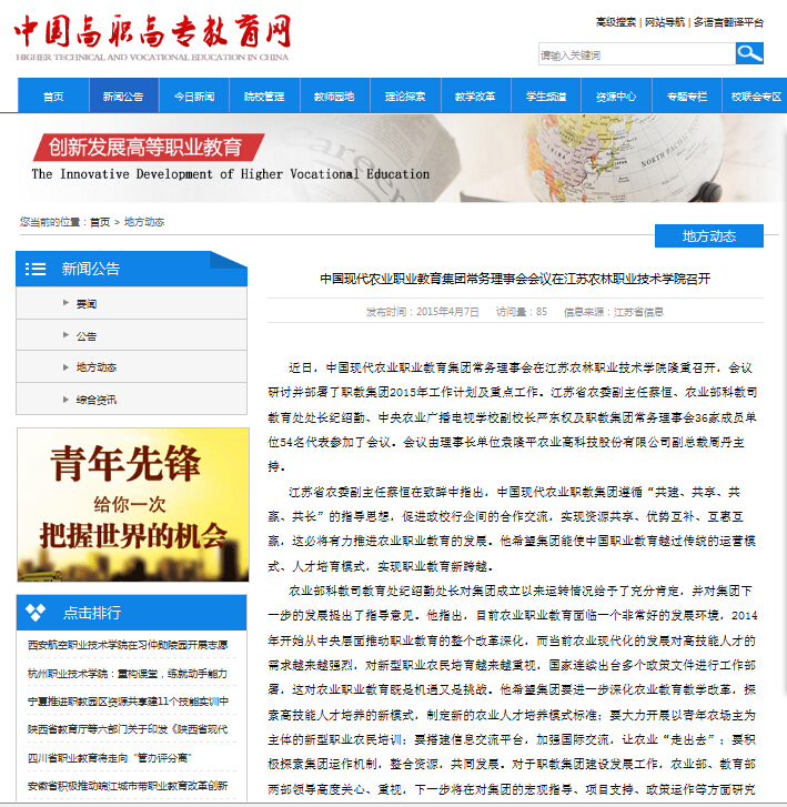 江苏省农委副主任蔡恒在致辞中指出,中国现代农业职教集团遵循“共建、共享、共赢、共长”的指导思想,促进政校行企间的合作交流,实现资源共享、优势互补、互惠互赢,这必将有力推进农业职业教育的发展。他希望集团能使中国职业教育越过传统的运营模式、人才培育模式,实现职业教育新跨越。