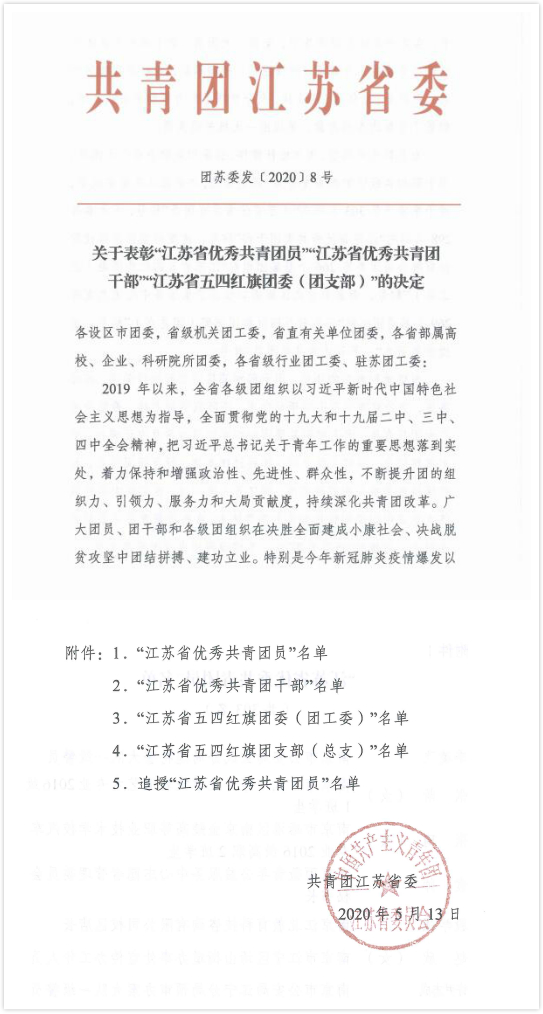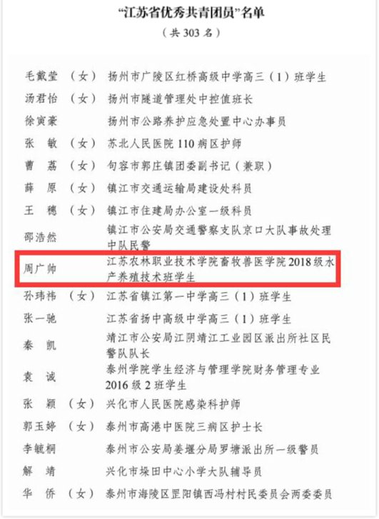 近日,2019年度“江苏省优秀共青团员”“江苏省优秀共青团干”“江苏省五四红旗团委(团支部)”评选结果揭晓。学院团委荣获“江苏省五四红旗团委”,畜牧兽医学院2018级水产养殖技术班周广帅荣获“江苏省优秀共青团员”。