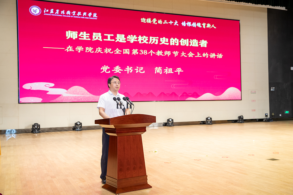 党委书记简祖平以“师生员工是学校历史的创造者”为题发表了热情洋溢的讲话。他指出,学院的发展愿景是“打造中国农业职业教育领军学校”,而“领军学校”,具体体现在品质卓越、师生健康幸福和治理现代化三个维度。他表示,应该从打通“人人出彩”的成长成功路径、建立“破五唯”的职称评价体系、开展“人岗相适”的岗位聘任工作、完善“优绩优效”的薪酬分配制度、构建“五育并举”的“三全育人”体系、开创“五聚焦五落实”的党建与思想政治教育新局面、落实“我承诺:”转变工作作风等七个方面着手,让师生健康幸福;应该从优化内部机构设置、理顺两级管理体制、探索教授治学机制、拓宽民主管理渠道、完善治理制度体系等五大举措着手,助推学院实现治理现代化。