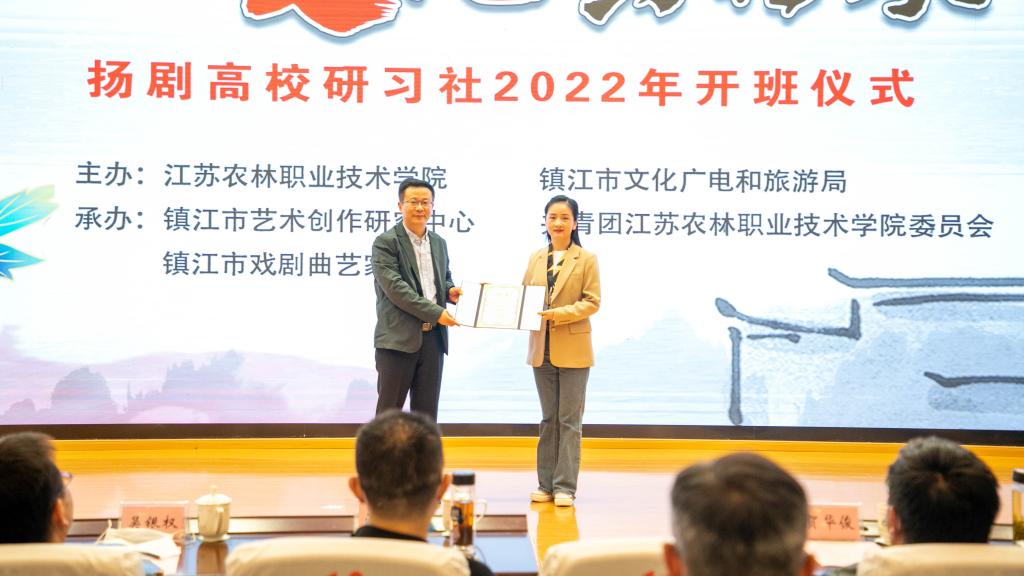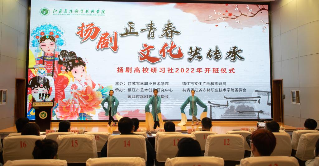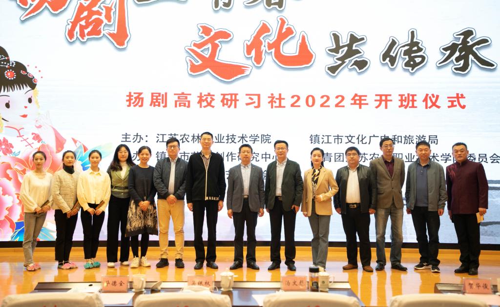 金秋十月丹桂飘香,梨园声声婉转悠扬。为弘扬中华优秀传统文化,激发青年学生学习传统文化的热情和兴趣,10月26日下午,由学院和镇江市文化广电和旅游局主办的“扬剧正青春 文化共传承”扬剧高校研习社2022年开班仪式在我院图书馆报告厅举行。学院党委委员、副院长毕德全,镇江市文化广电和旅游局副局长吴银权及200余名师生参加了活动。