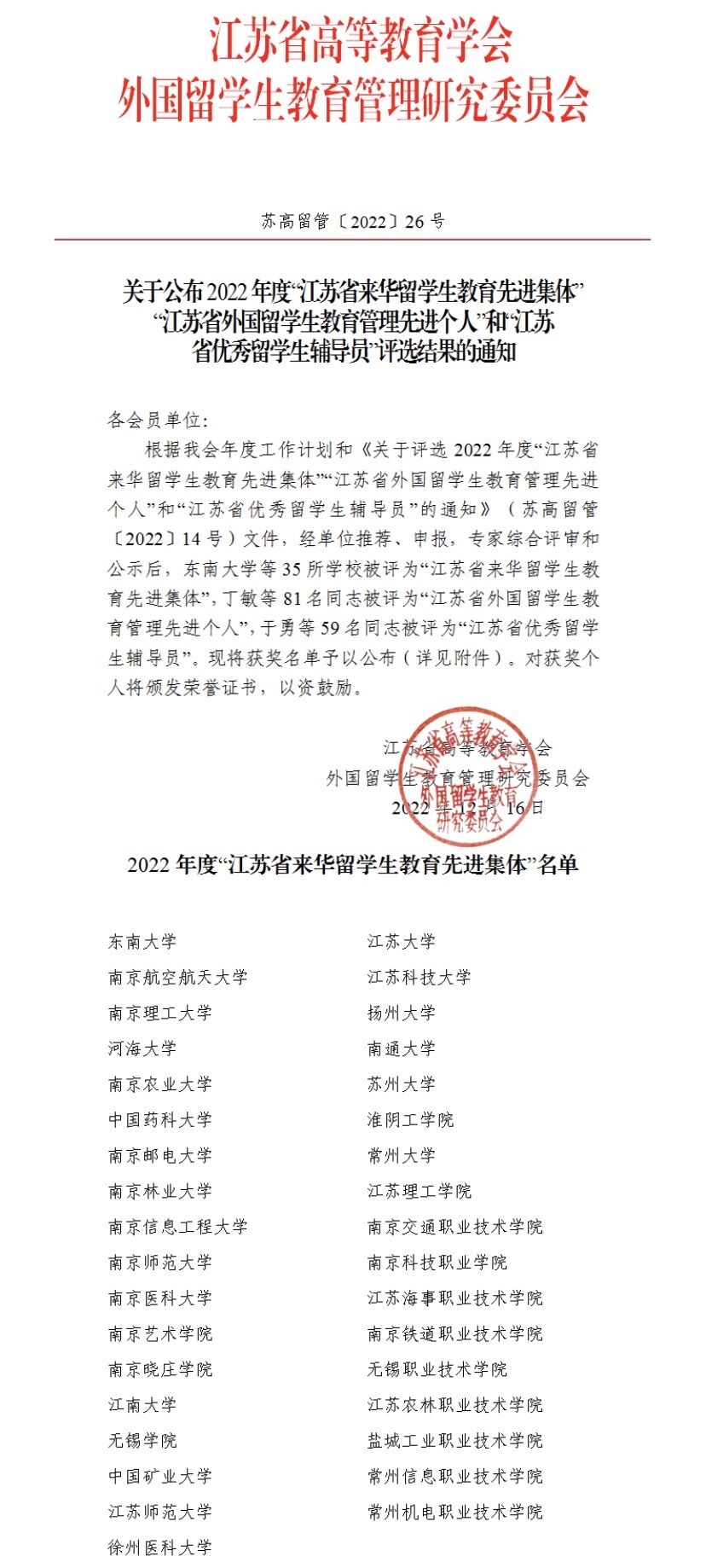 近日,江苏省高等教育学会外国留学生教育管理研究委员会公布2022年度“江苏省来华留学生教育先进集体”评审结果,我院荣获“江苏省来华留学生教育先进集体”称号,包括本科在内获评高校共35所,其中高职院校9所。