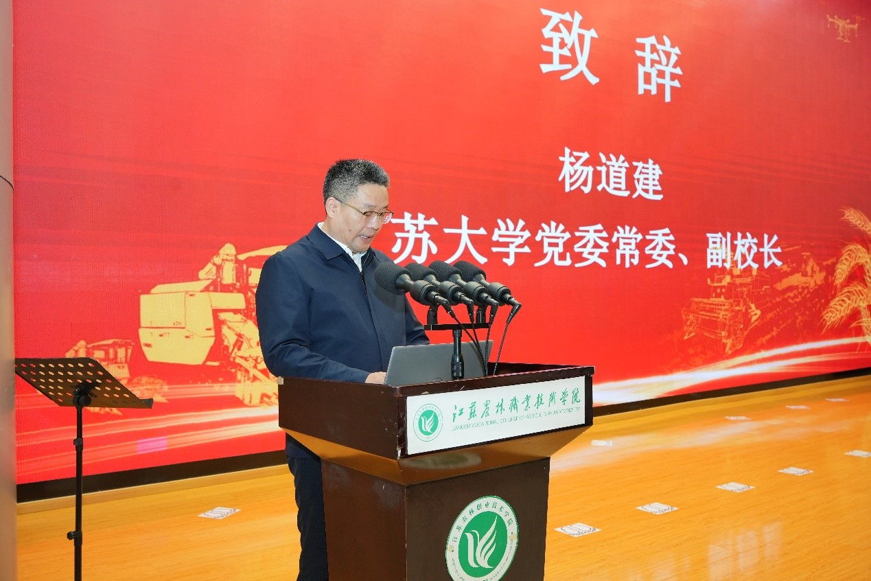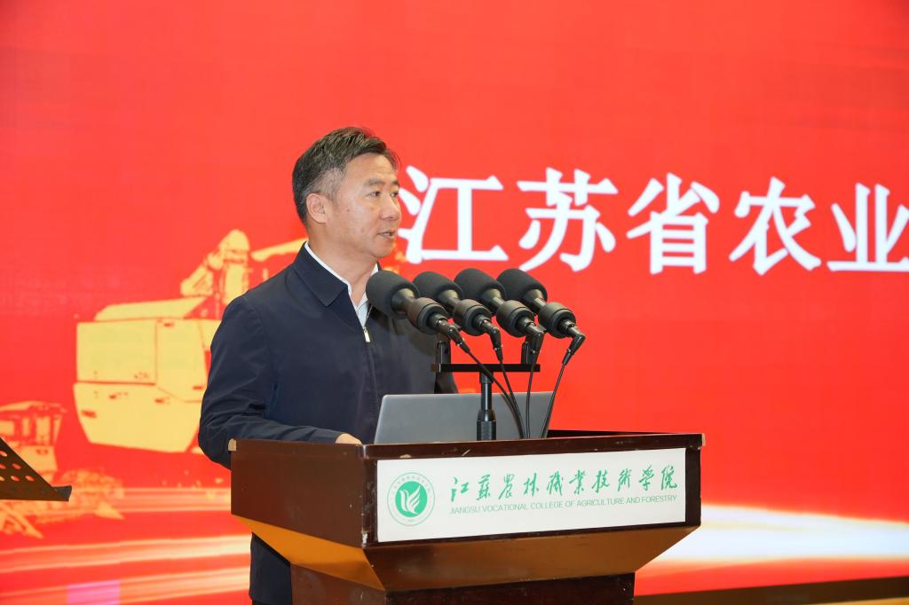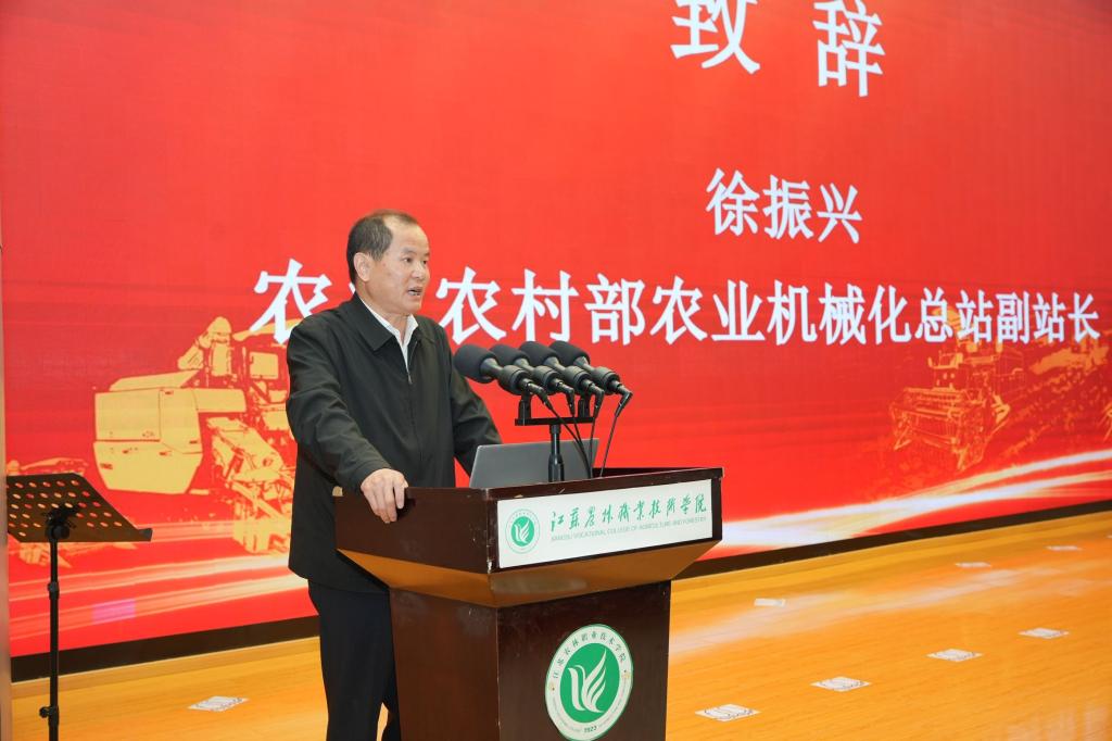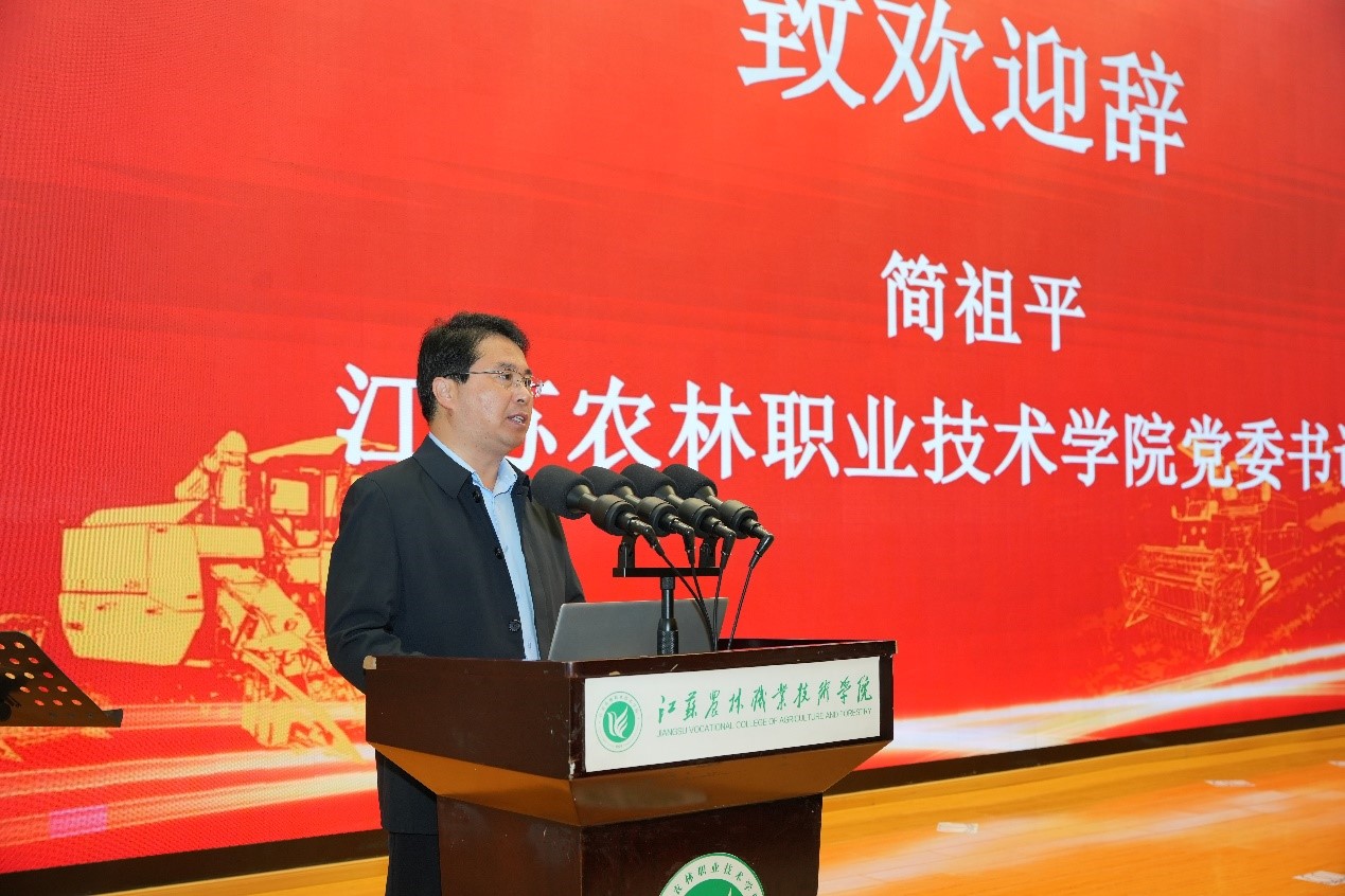 江苏农林职业技术学院党委书记简祖平致欢迎辞,未来学院将充分发挥现代农业装备应用技术等相关专业综合优势,汇聚各类创新和发展要素,在制度、人才、资金等方面给予支持,尽最大努力提供更优环境、更好服务,与共同体成员单位协同培养更多具备精熟技能、具有创新精神、适应农业机械化全程全面高质量发展的高素质技术技能人才。