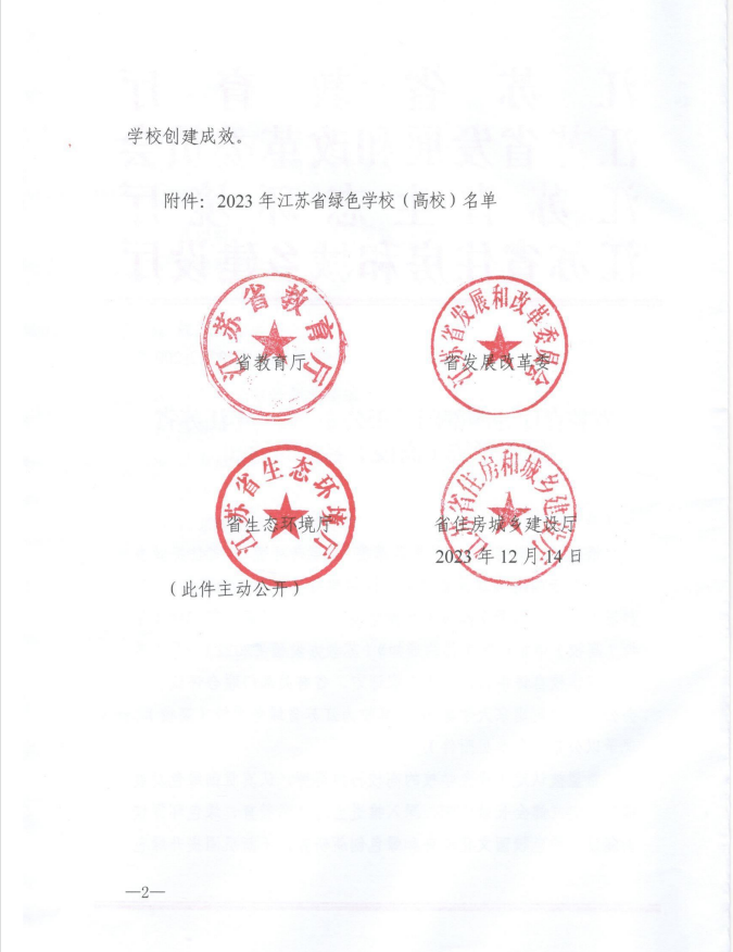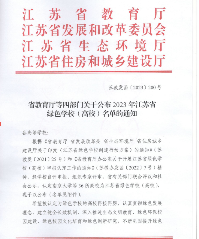近日,省教育厅、省发展改革委、省生态环境厅、省住房城乡建设厅联合发文,公布2023年江苏省绿色学校(高校)名单,我院获评“江苏省绿色学校(高校)”。