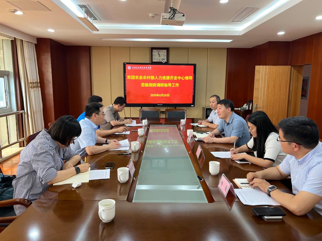 6月25日,农业农村部人力资源开发中心纪委书记牛敏杰一行四人来院开展新农人培养工作专题调研。省农业农村厅科教处吴洁,学院党委委员、副院长颜志明,亚夫新农人学院、乡村振兴学院、江苏农博园等相关人员参加本次调研。