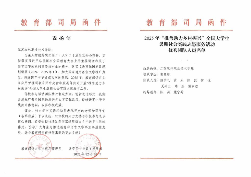 12月12日,教育部语言文字应用管理司、共青团中央青年发展部向我院发来函件,对我院参与“推普助力乡村振兴”全国大学生暑期社会实践志愿服务活动并表现突出的老师和同学们予以表扬,对学院的大力支持与积极参与表示衷心感谢。