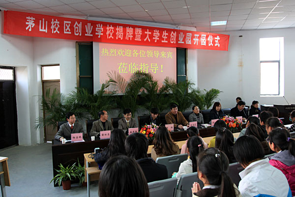 12月8日下午,茅山校区大学生创业教育学校揭牌暨创业园开园仪式在校区报告厅隆重举行。国家人社部高级职业指导师黄以昭、学院党委王润贤副书记、 07届毕业生成功创业者代表郭翔和各相关系部负责人、创业教育学校学员、创业店铺成员等出席仪式。仪式由茅山校区管委会主任曹仁勇主持。
