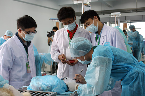 相关准备就绪,选手们进入紧张有序的比赛状态。裁判员、工作人员、志愿者等各就其位,各司其职。整个比赛现场井然有序,选手们镇定自若,争分夺秒地为动物进行手术,天蓝色的手术服成为场内一道亮丽的风景线。比赛其间,偶有手术台上出现犬吠声,大家依然心无旁骛,开腔、止血、缝合,技术娴熟。裁判们认真督察手术进程,公开、公平、公正地打分记录,尽职尽责。有些选手中途手术帽脱落,工作人员都眼疾手快地为其戴好,确保选手们一心一意地进行比赛,发挥出他们的最佳水平。