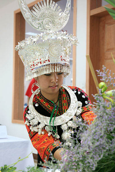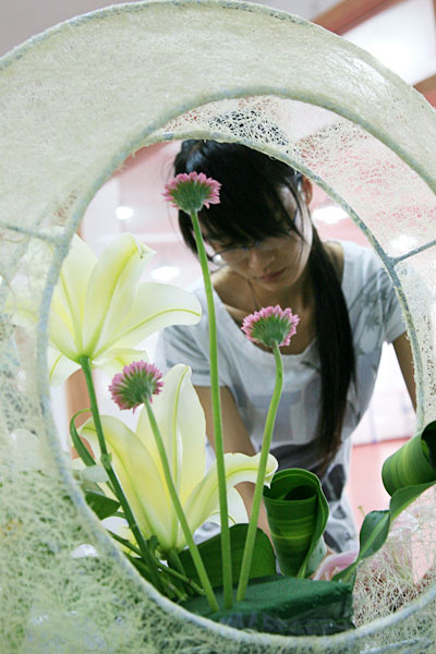 比赛开始,选手们纷纷拿出了各种“花器”,填入花泥,插上各种形态各异、色彩多样的花草藤叶等,在短短的时间里,制作出一幅幅独具风格的作品。选手们来自全国各地,但他们都十分注重各种花材的色调、姿态和神韵,充分发挥各自的特长,体现各地的特色。作品古朴自然、清新典雅,突出表现了当今社会生态环境受到严重破坏,呼吁构建和谐家园的主题,倡导人们低碳生活的理念。千姿百态、造型各异的作品,借用古色古香的道具,用独特的构景手法,将传统文化蕴含其中,妙趣横生,回味无穷。