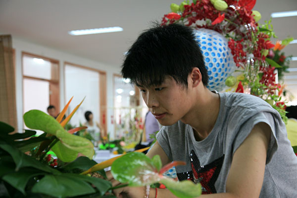 学生在插花比赛中