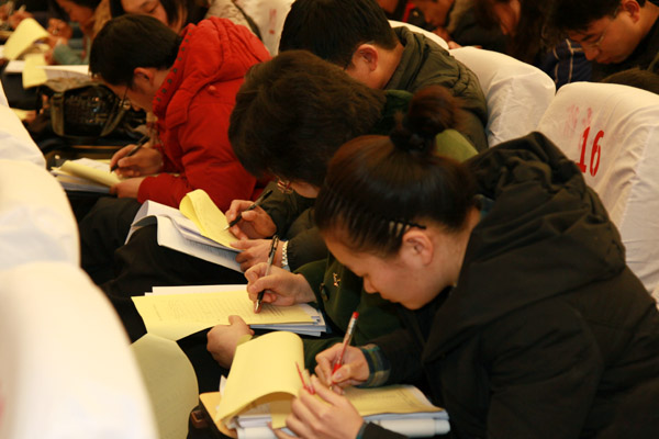 代表们认真填写民主测评表