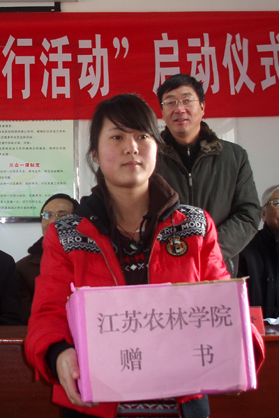活动开始之前举行了简短而热烈的启动仪式,镇江市委常委、组织部部长魏红军出席活动并讲话。在仪式上驻镇四所高校领导分别向该镇贫困学生进行了捐款活动。王润贤副书记代表我院向该镇贫困学生捐款6000元,并向该镇农村图书室捐赠科技图书100本。