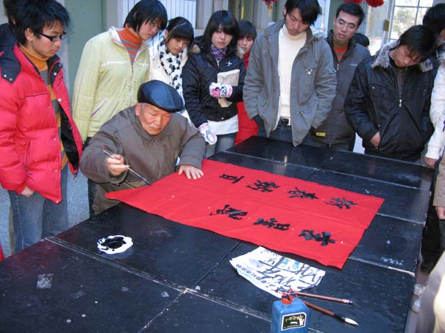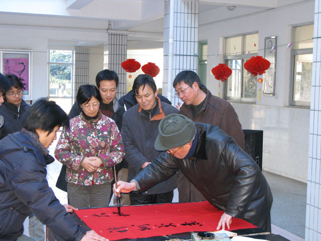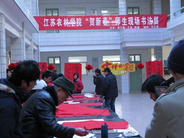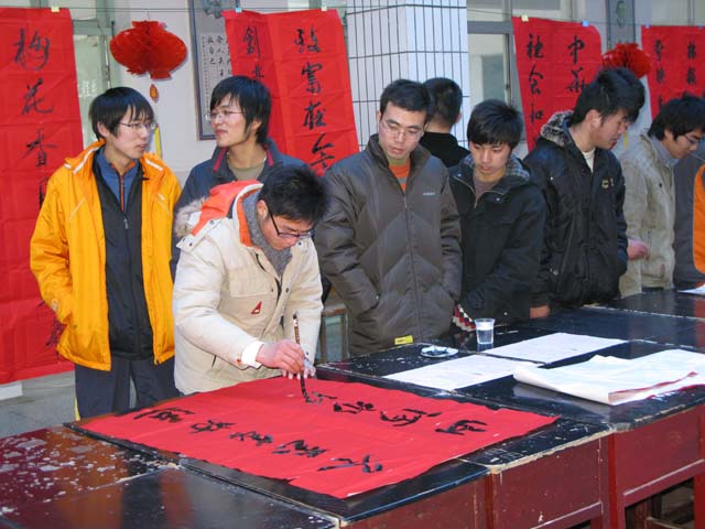 在新春佳节到来之际,院关工委、工会、团委联合主办,社艺系协办的“贺新春”师生书法展活动,于1月10日下午在理科楼一楼大厅举行,学院党委王润贤副书记、苏小冬副院长、工会陈志明主席、团委毕德全书记、梁凯副书记等领导莅临现场参观了书法展。此次活动,邀请到了学院王仲飞、陈道义两位退休老教师现场泼墨挥毫为广大师生书写春联。众多学生书法爱好者也积极参加,写下新年的祝福! 此次书法展活动,让广大师生领略了书法艺术的魅力,推动了大家对传统文化的认识。同学们纷纷表示,与两位老前辈在一起讨论笔风,让他们受益匪浅。