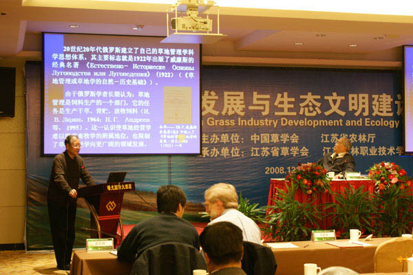 中国草学会首席顾问、中国工程院院士任继周先生作了《草业科学专业职业教育框架刍议》的报告,任院士就草业职业教育的发展方向和培养目标进行具体分析和设计。中国农业科学院原副院长、中国工程院院士刘更另先生从重温小平同志关于农业和肥料工作的意见出发,作了《对当前农业和草畜业形势的认识》的报告。江苏农林职业技术学院副院长、研究员俞禄生先生就江苏农林职业技术学院草业科学实践研发发表《草业发展与草产品创新》的报告。南京农业大学沈益新教授作了题为《江苏草业发展现状的分析》报告,全面介绍江苏草业在饲草生产利用以及草坪绿化上的发展状况。中国草学会顾问、中国科学院植物所研究员陈佐忠先生从草原的生态屏障功能、草原的固碳功能、草原能量固定的功能、草原是丰富的基因库、土壤形成新格局的模式、草原生态旅游的功能六个方面系统的介绍了草原生态功能多样性的研究。中国草学会顾问、甘肃农业大学教授胡自治先生就国内外草叶高等教育发展情况,阐述了我国的高等草业教育及其在世界的地位。中国老教授学会林业专业委员会主任任荣荣先生作了题为《种桑养畜——建设具有中国特色有机功能畜牧业》的报告,介绍了饲料桑轮牧的情况,内容新颖。中国草学会副理事长、中国农业大学教授周禾先生向与会专家介绍中国草学会草坪专业委员会第十一次学术研讨会会议情况并总结了当前中国草坪科学研究现状。中国草学会副理事长、中国农业科学北京畜牧兽医所研究员李向林先生作了题为《南方草地农业系统》的论坛发言,探讨了中国南方草地农业的可持续发展道路。北京林业大学教授卢欣石先生系统地介绍了中国牧草种质资源50年的发展历程。中国农业科学院草原所所长、研究员侯向阳先生以我国草地农业发展思考和措施为题,深入探讨我国草地农业体系建设的主要思路和我国草地农业发展的措施。北京林业大学教授韩烈保先生从中国高尔夫球场发展历史和中国高尔夫球场数量预测两个方面介绍了中国高尔夫球场发展与数量预测。上海交通大学教授王兆龙先生作了《追寻林克斯的真谛》的报告,阐述了林克斯球场的含义、特征、起源,并对林克斯风格球场进行了个案分析。Charles Sturt University教授David Kemp先生介绍了澳大利亚草地及其发展情况。兰州大学教授沈禹颖女士作了发展草地农业、推进甘肃草地畜牧业发展,全面介绍了甘肃草业发展情况。
