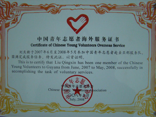2007年6月,我院刘庆新同志作为中国江苏首批赴圭亚那青年志愿者之一,远赴圭亚那开展志愿者服务活动。过去的一年里,远离祖国和亲人,克服语言、文化、环境等各种困难,深入城市、乡村和各级机构,在教学等领域大力开展志愿者服务,用劳动、智慧和汗水谱写了一曲动人的志愿者之歌。 目前,刘庆新同志被共青团江苏省委评为“江苏省新长征突击手”。学院团委号召全院广大师生团员学习团结友爱、助人为乐、甘于奉献的志愿者精神,各系团组织要积极开展志愿者服务活动,进一步学习社会主义荣辱观,大力弘扬志愿者服务精神。
