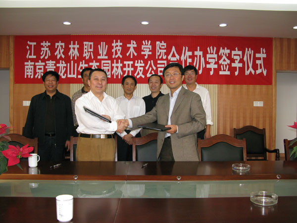 10月22日上午,我院与南京青龙山生态园林开发公司继续合作办学签字仪式在综合楼八楼会议室举行,院领导朱洪生、黄焱、俞禄生、王润贤及南京青龙山生态园林开发公司董事长朱明亮出席签字仪式。签字仪式在友好而热烈的气氛中进行,黄焱院长和朱明亮董事长分别代表江苏农林职业技术学院及南京青龙山生态园林开发公司在合作办学协议书上签字。此次双方的进一步合作,标志着我院校企合作办学模式的进一步深化,必将对我院办学模式的改革和创新产生深远影响。(办公室)