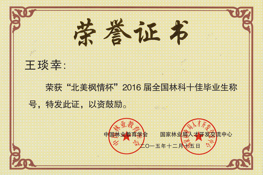 12月15日,由中国林业教育学会和国家林业局人才开发交流中心共同举办的“北美枫情杯”2016届全国林科十佳毕业生评选表彰大会在浙江农林大学举行。我院13级园林技术专业王琰幸同学荣获全国林科十佳毕业生称号,殷梓苡、殷悦、孙雪敏、马浩、任冬楠等5名同学荣获全国林科优秀毕业生称号,风景园林系党总支副书记饶鑫荣获优秀组织个人奖,我院荣获优秀组织单位奖。