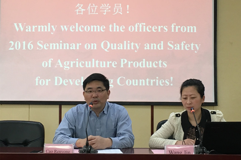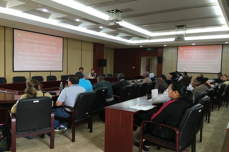5月14日,2016年发展中国家农产品质量与安全研修班学员来我院参观学习,学员分别来自文莱、印度、肯尼亚等12个国家。欢迎仪式在综合楼九楼会议室举行,学院副院长曹仁勇、国际交流合作中心副主任王瑾及相关部门同志出席了欢迎仪式。