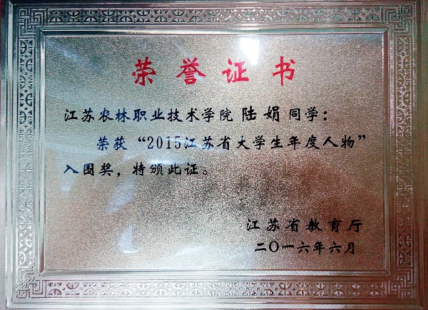 6月16日,“2015江苏省大学生年度人物暨高校辅导员年度人物”颁奖典礼在南京大学举行。我院畜牧兽医系2013级宠物养护与疫病防治专业陆娟同学、辅导员朱晓宦老师荣获“2015江苏省高校辅导员年度人物暨大学生年度人物”入围奖。