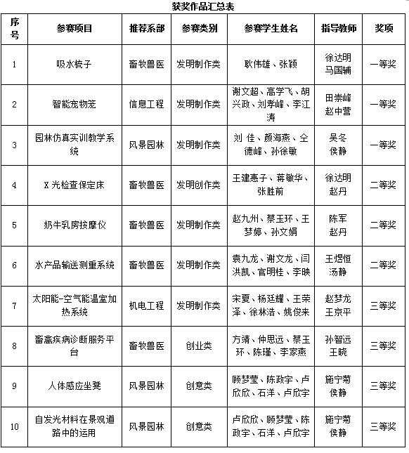 10月15日至16日,第十一届全国高职高专“发明杯”大学生创新创业大赛决赛在江苏建筑职业技术学院举行。本次大赛我院共有21件作品参赛,其中吸水梳子、智能宠物笼、园林仿真实训教学系统等三件作品获得一等奖;X光检查保定床、奶牛乳房按摩仪、水产品输送测重系统等三件作品获得二等奖;太阳能-空气能温室加热系统等四件作品获得三等奖。吴冬、马国辅、田崇峰、陈军、汤静、赵梦龙等六位老师被评为“优秀指导教师”,董燕红老师被评为“组织工作先进个人”。