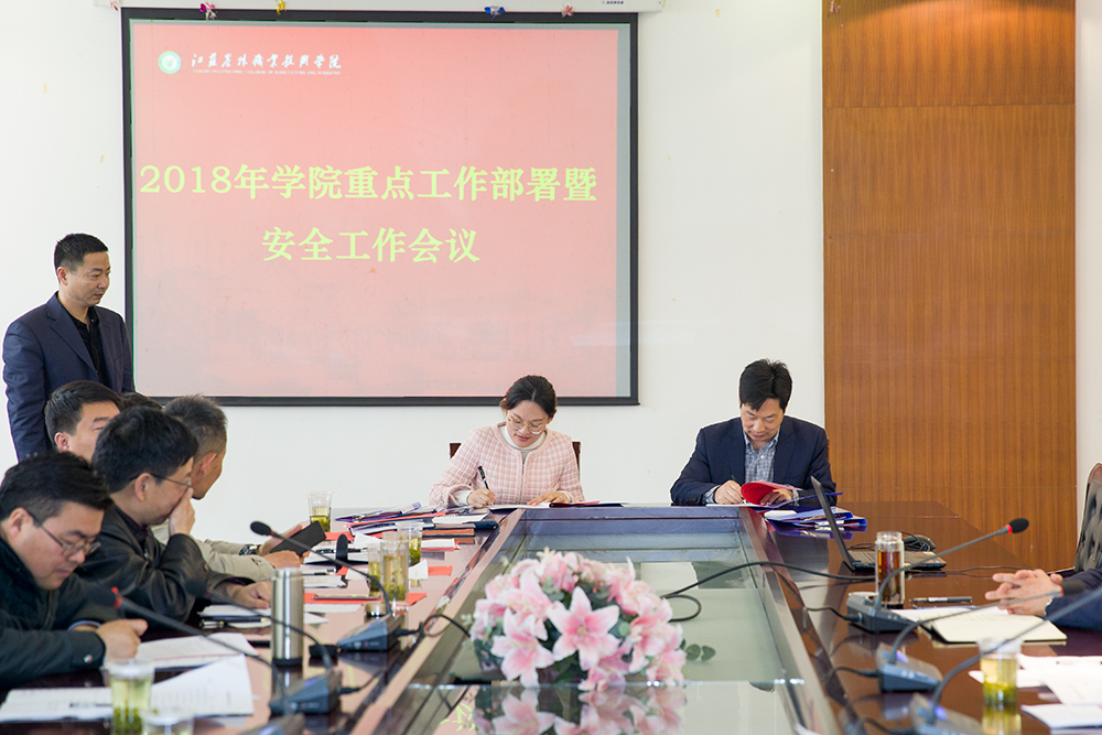 会议分别对2018年学校重点工作、2018年事业经费预算进行了解读、部署,曹仁勇副院长作安全工作报告,巫建华院长与各部门签署了安全工作责任状。