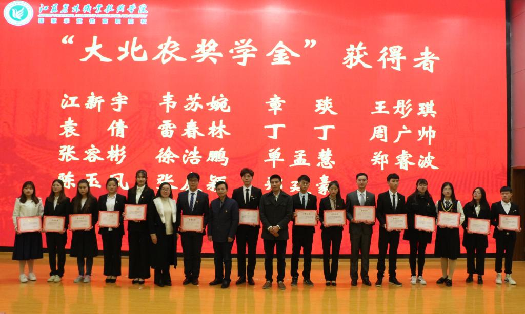 颁奖仪式上,来自畜牧兽医学院的张容彬等15位学生获得了“大北农”励志奖学金。大北农集团的江苏区人力董经理结合当前农业发展的大环境,希望同学们树立崇高理想目标,努力学习,扎实工作,在农业的舞台上奉献自己的青春,施展自己才华,实现人生理想。