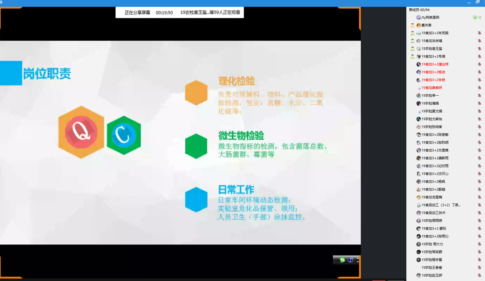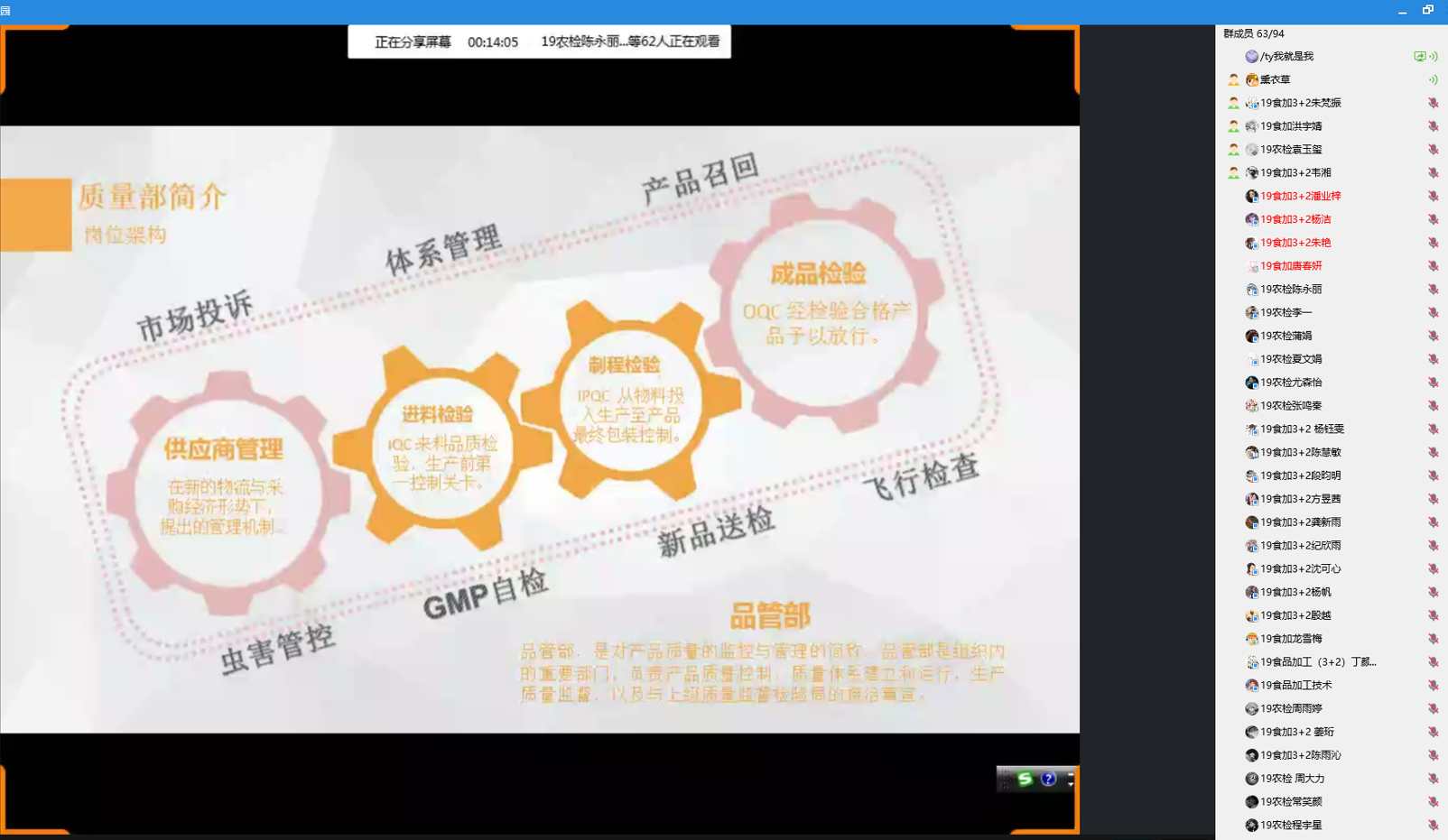 9月18日下午,茶与食品科技学院举办了名企工匠进校园系列活动之“提升质量管理技能 为食品安全保驾护航”讲座,活动邀请了含羞草(江苏)食品有限公司质量工程师陈军主讲,食品加工专业的同学参加了本次活动。陈军工程师以含羞草食品为例介绍了质量管理部的岗位架构、组织架构、部门职责、岗位职责、并展示实验室,现场监控场景。