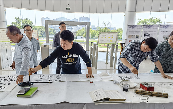最是“墨”香能致远,振奋精神诗书画。5月22日,由图书馆、团委和工会联合举办的“书写红色经典、传承传统文化书法比赛、展览暨爱好者笔会”等活动在图书馆举办。学院工会主席江德明、图书馆馆长张田林,句容市文联主席傅丽莉,句容市二十余名书画名家及我院书画爱好者参加了活动。