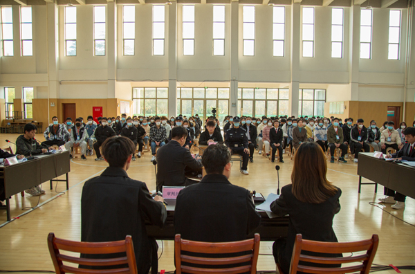 “现在开庭!”随着审判长的法槌敲击,庭审现场一片庄严肃静。本次“模拟法庭”分法庭调查、举证质证、法庭辩论、庭审教育、法庭判决等环节。现场,同学们慷慨激昂、义正辞言,生动地展示了司法工作人员认真、严谨、一丝不苟的法律工作态度以及公平、公正的法律工作精神,营造出了法庭严肃、庄重的氛围,让所有在场的旁听人员都真正融入到了整个审判过程中。
