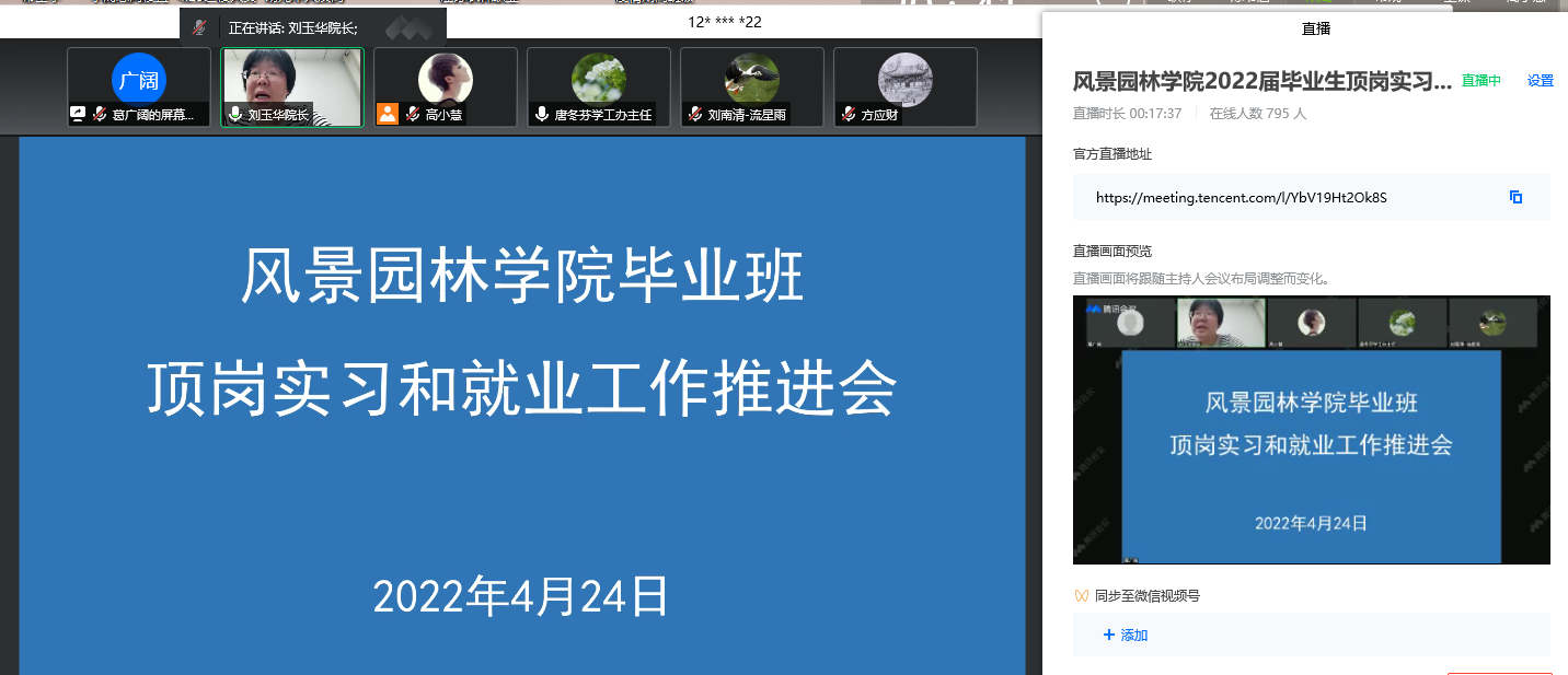 近日,风景园林学院线上召开毕业生顶岗实习和就业工作推进会。2022届全体毕业生、班主任以及学院专业负责人参加了会议。