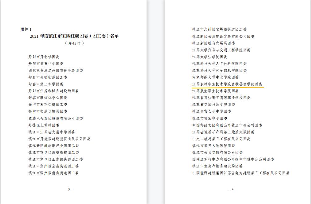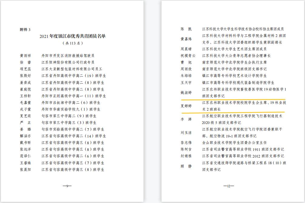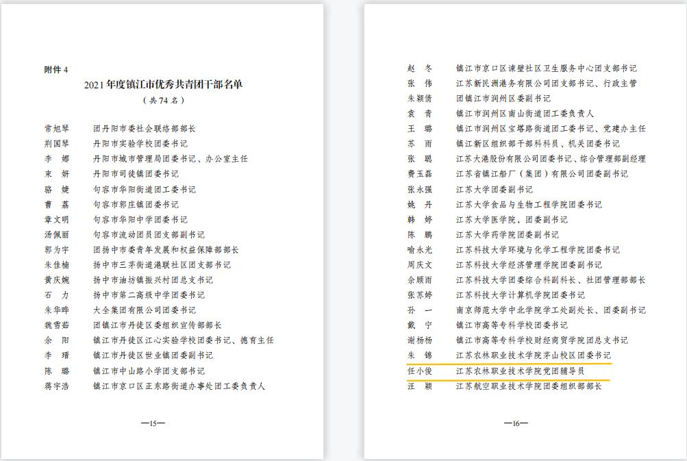 我院姚淑婷、夏婷婷2位同学荣获“镇江市优秀共青团员”,朱锦、任小俊2位教师荣获“镇江市优秀共青团干部”,畜牧兽医学院团委荣获“镇江市五四红旗团委”,农学园艺学院20现代农业技术(定制村干)1班团支部荣获“镇江市五四红旗团支部(总支)”。