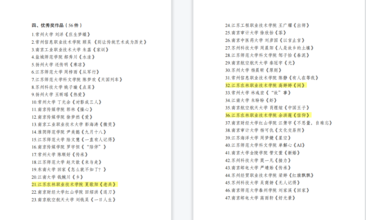 近日,由团省委主办的“微小说·新时代”江苏省大学生原创微说大赛评审结果公布,经学院团委推荐,19园林技术4班耿豪同学的作品《重阳》获三等奖,20级数字媒体应用技术4班夏歌阳同学的作品《老兵》、19园林技术4班高婷婷同学的作品《闲》、19茶艺与茶叶营销余洪莲同学的作品《信仰》获优秀奖。