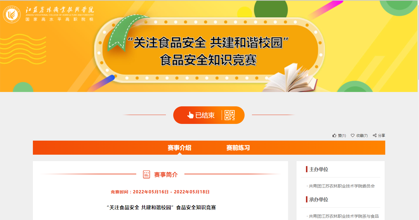 为切实加强大学生食品安全教育,提高大学生食品安全意识,5月16-5月18日,由学院团委、学生工作处、后勤服务总公司主办,茶与食品科技学院团委承办的“关注食品安全共建和谐校园”食品安全知识竞赛活动成功举办,1563名同学在线完成了竞答。