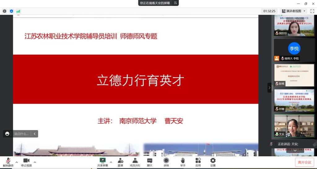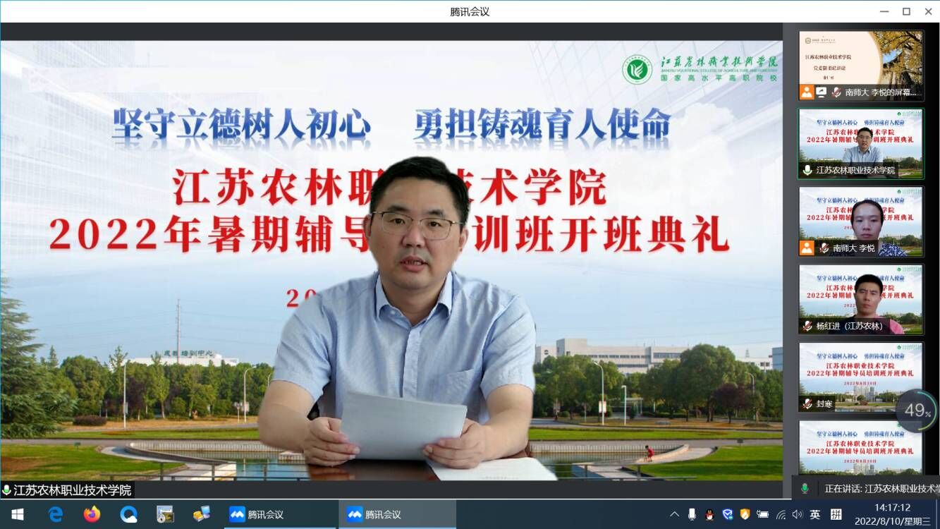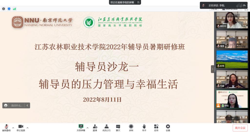 8月10日-14日,我院线上举办了2022年辅导员暑期培训班,为推进我院辅导员队伍职业化和专业化建设,提升辅导员职业素养和工作能力,培训采用集中授课和分组主题沙龙两种形式开展。学院党委副书记曹仁勇出席了开班仪式,学生工作处相关同志和各二级学院、茅山校区专职辅导员参加了培训。
