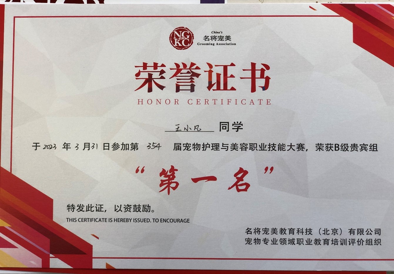 3月31日,第354届NGKC宠物美容护理与美容职业技能大赛在苏州顺利举办。本次美容大赛包括精英赛组、专业组、创意组。畜牧兽医学院2020级宠物养护与驯导专业王小凡同学在专业组(B)级比赛中获得第一名。