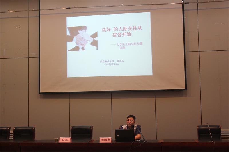为拉进宿舍同学之间的距离,培养良好的寝室人际关系,进一步构建和谐宿舍。近日,风景园林系邀请南京林业大学材料学院党委副书记孟国忠在研发楼报告厅举办了大学生宿舍人际交往心理讲座。 孟老师从学生角度以自身为例介绍了人际交往和人际关系基本知识,并就目前宿舍人际交往现状和处理人际关系提出了几点建议。期间,还穿插播放了既诙谐幽默又富有深意的视频,全面诠释了大学生宿舍人际交往在日常生活中的重要性。他的循循善诱的演讲使得在场同学深受启发。