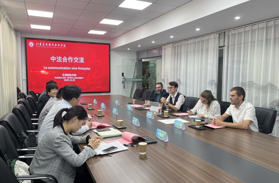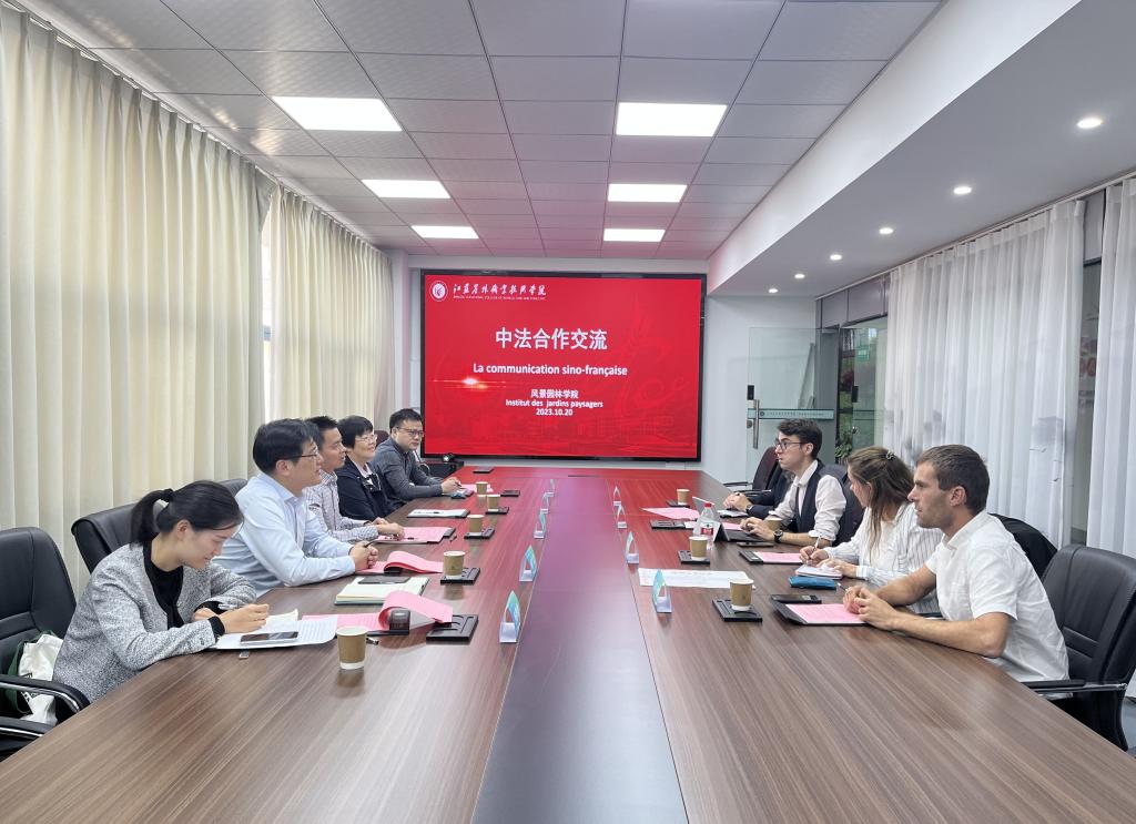 10月20日,中法农业教育合作中心主任莫诺·马克斯(MONOT Max),艾内邦农业学校园艺技术专业教师艾尔诺·比隆(Arnaud Billon)、玛丽·肖塔尔(Marine Chotard)、斯蒂芬(Stéphan Masquelin)来我院洽谈合作办学项目。风景园林学院党总支书记熊伟,党总支副书记、院长刘玉华,国际教育学院院长杨广荣等相关负责人员参加座谈会。