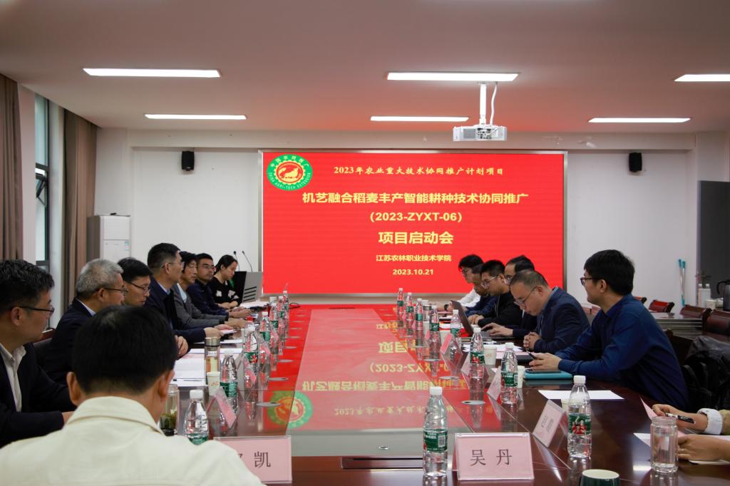10月21日下午,机电工程学院承担的2023年农业重大技术协同推广计划项目——“机艺融合稻麦丰产智能耕种技术协同推广”(项目编号:2023-ZYXT-06)项目启动会暨江苏稻麦智能种植产业技术协同推广联盟成立大会在我院成功召开。江苏省农业农村厅科教处副处长黄银忠、学院党委副书记曹仁勇以及项目主持单位、协作单位、推广单位的骨干成员参加了会议。