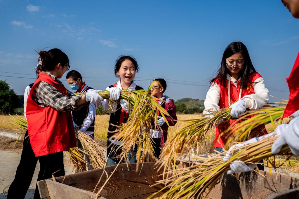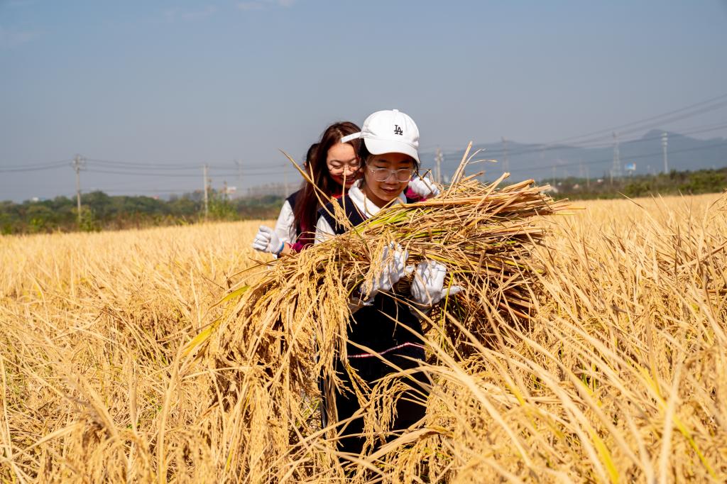 活动中,基地老师首先向同学们讲述了水稻的起源、种植、收割、加工等基本知识,并示范了传统镰刀割稻子。在积极分子的带领下同学们分成10组,开始了割稻子、打稻穗等比赛,欢快声和稻谷粒一起在空中飞舞,现场气氛异常热烈。比赛结束,大学生还带领小朋友一起参观了农业科技馆,为小学生们讲述了更多的农耕故事和农业科技知识。