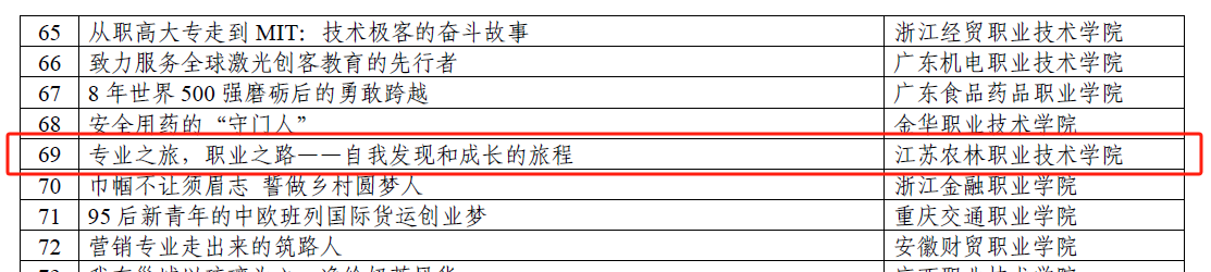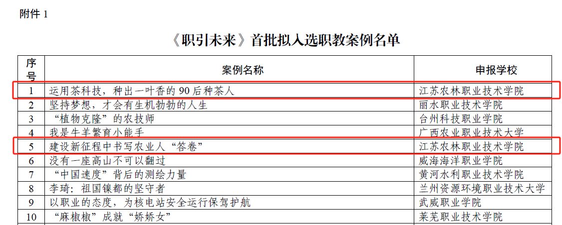 近日,高校毕业生就业协会秘书处发布了《关于公布<职引未来>首批拟入选职教案例的通知》,江苏省共6所高职院校8个案例入选,其中我院入选3个,分别是《运用茶科技,种出一叶香的90后种茶人》《建设新征程中书写农业人“答卷”》《专业之旅,职业之路——自我发现和成长的旅程》。