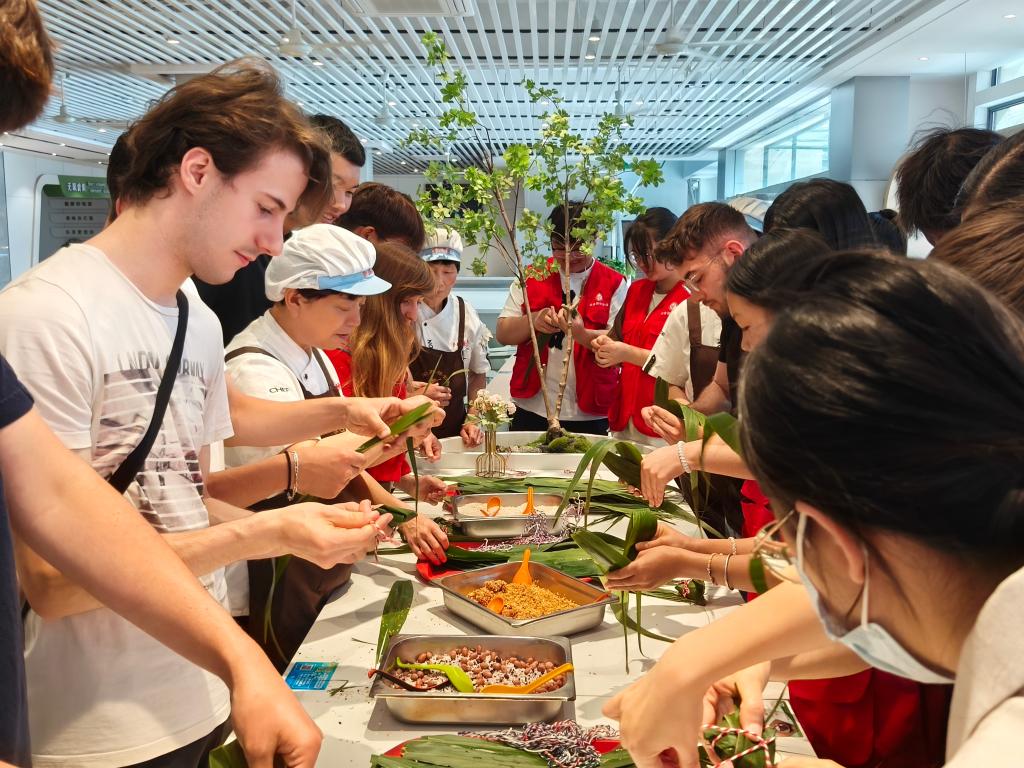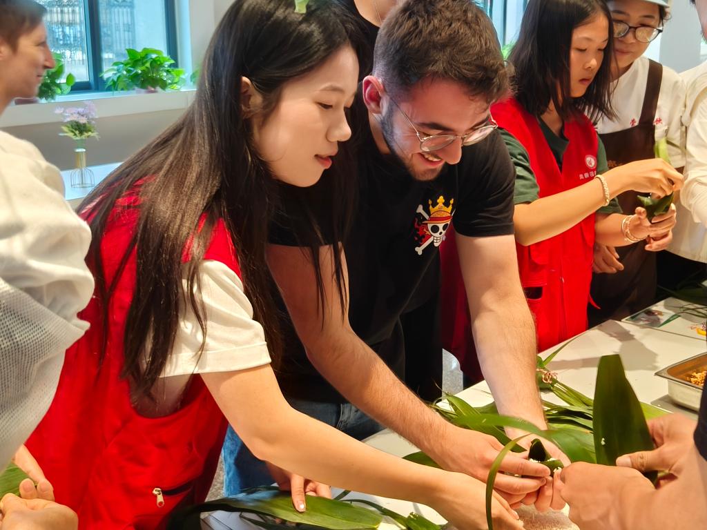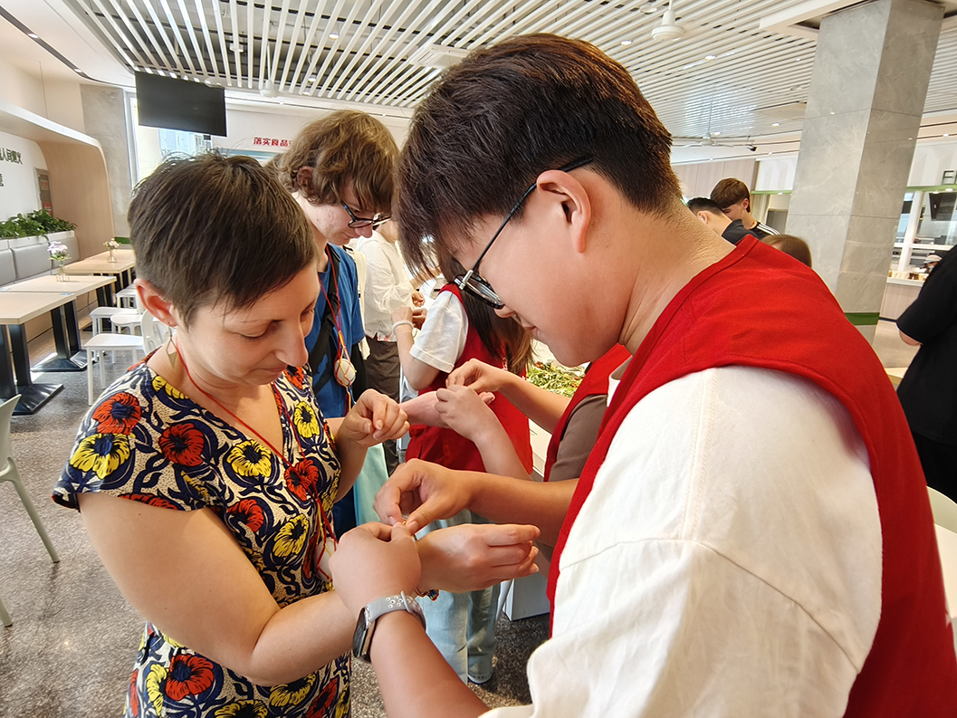 活动现场,罗璇老师介绍了端午节的由来和文化内涵。食堂阿姨带领大家包粽子,“先拿起两片粽叶,将叶子卷成漏斗形,再放入糯米、红枣、红豆......”,法国学生认真地学习,包出的粽子有模有样。志愿者还给法国学生带上了寓意美好的五彩绳和蛋兜,大家以“粽”传情,分享团聚的喜悦,共迎佳节,在喜庆祥和的氛围中互道安康。