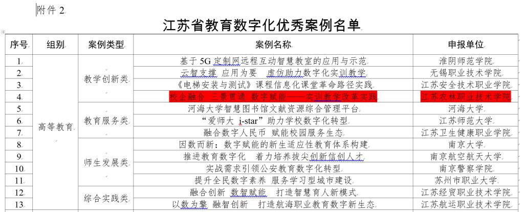 近日,江苏省教育厅发布《关于公布教育数字化典型应用场景和优秀案例征集结果的通知》(苏教信办函〔2024〕26号),信息工程学院申报的《校企融合 三景贯通 数字赋能——实训教学改革实践》案例成功入选高等教育组别教学创新类教育数字化优秀案例。