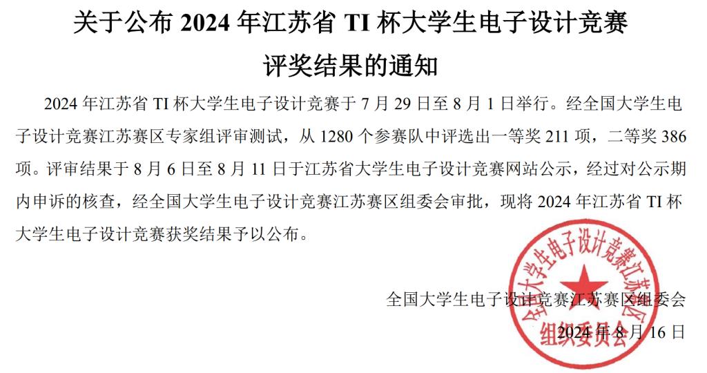 8月6日,2024年江苏省大学生电子设计竞赛落下帷幕。本届竞赛由全国大学生电子设计竞赛江苏赛区组委会主办,东南大学与南京信息职业技术学院承办,美国德州仪器(TI)公司协办,共有来自省内70余所本科、高职院校的1280支队伍、3840名学生报名参赛。信息工程学院学子喜获一等奖1项、二等奖1项。