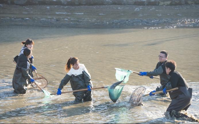 随后,活动进入了激动人心的捕鱼环节。师生们身着专业的捕鱼服装,手持抄网,分组协作,展开了一场紧张而有趣的捕鱼活动。师生们分工明确,有的负责赶鱼,有的负责抄网捕鱼,还有的负责将捕上来的鱼儿进行分类和称重。在捕鱼过程中,学生们不仅体验到了劳动的乐趣,更深刻领悟到了劳动带来的收获。
