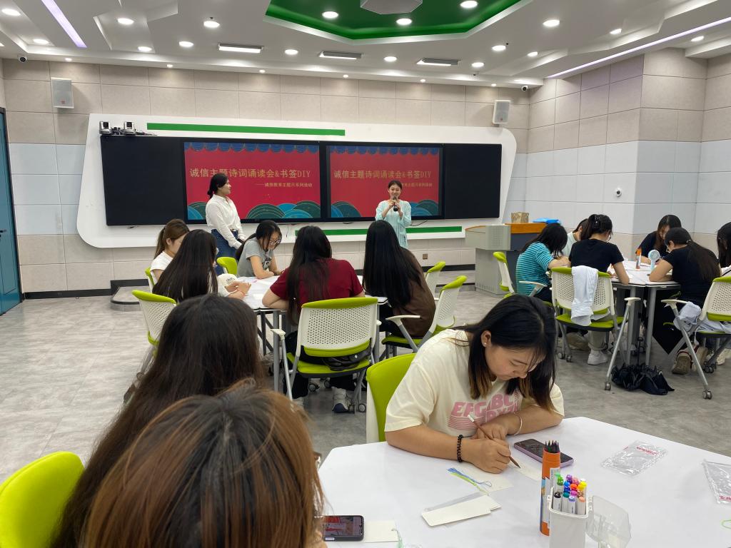 开展“诗韵传诚信、巧手制书签” 主题活动,通过沉浸式的文化体验,弘扬中华优秀传统文化,深化诚信教育内核。在诚信诗词诵读环节,学生们以饱满的热情朗诵了一首首经典诚信诗词。在书签制作环节。学生们充分发挥想象力与创造力,将对诚信的理解融入到书签设计中。通过将传统文化与诚信教育有机融合,让学生在动手实践与文化熏陶中,深刻理解诚信的价值。
