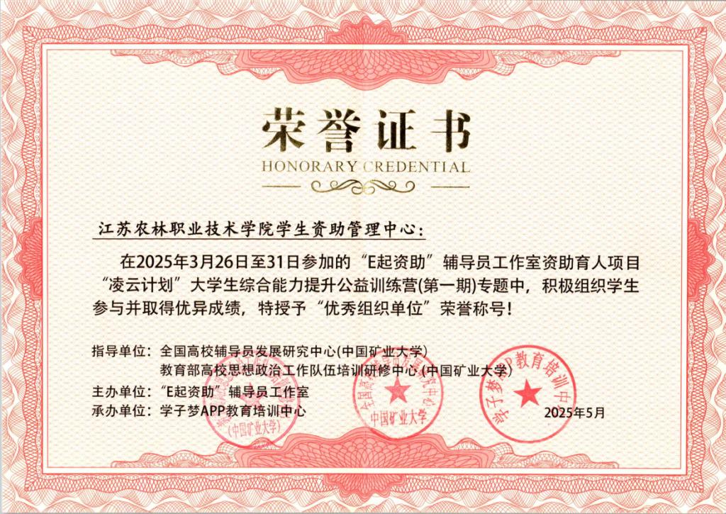在2025年“凌云计划”大学生综合能力提升训练营中,我院取得佳绩,学生资助管理中心被授予“优秀组织单位”,孙颖被授予“优秀指导老师”;畜牧兽医学院姜宁同学和农学园艺学院李心雨同学被授予“优秀学员”。