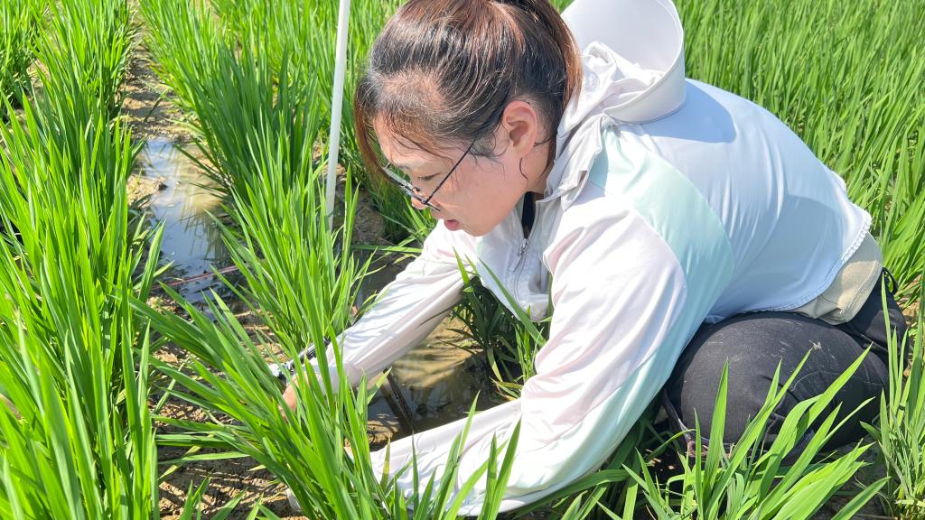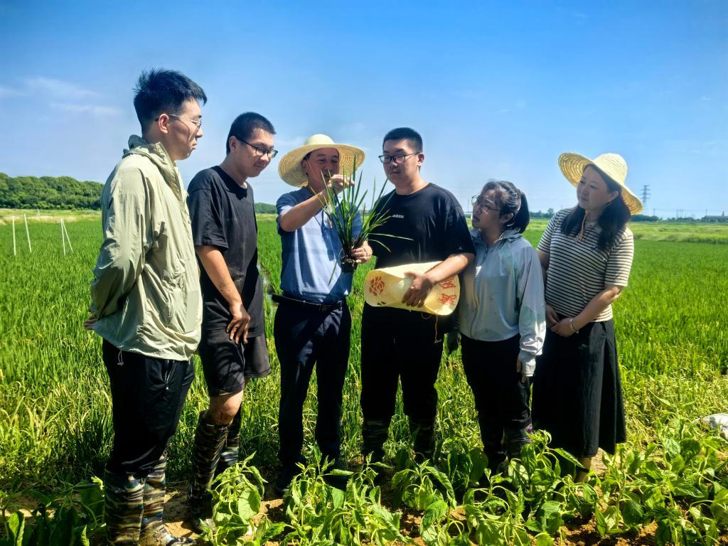 此次指导聚焦南粳46号水稻品种的田间管理。该品种为中熟晚粳类型,分蘖性中等偏强,当前处于9叶期,正是分蘖盛期。杨宝林指出,9叶期需遵循“时到不等苗,苗到不等时”原则,最迟在有效分蘖临界叶龄前(10叶期)开始搁田,确保亩茎蘖苗控制在18-20万穗,避免群体过大导致倒伏风险。针对机插稻根系浅、个体弱的特点,服务团特别强调搁田需采用“轻搁、多次”技术。具体标准为:田边裂小缝、田中硬皮、表土不白时上浅水,反复操作至田土沉实、人走不陷脚,叶片硬直、叶色褪淡。杨宝林现场示范,指导学生通过系统调查分蘖数、叶龄等指标,精准判断搁田时机。服务团还提出了“三看”原则精准控水:看苗情,群体茎蘖数达目标穗数80%时排水轻搁;看地情,黏土田开“井”字沟,沙土田多次轻搁;看天情,日均温>32℃时保留3cm“护苗水”防高温伤苗。