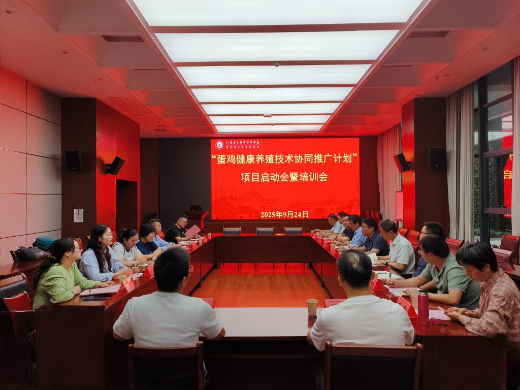 9月24日,2025年农业重大技术协同推广计划——“蛋鸡健康养殖技术协同推广计划”项目启动暨培训会在我院大学生艺术活动中心101举行。项目首席专家团队成员、各推广单位代表、示范基地负责人以及我校畜牧兽医学院相关领导共同出席了本次会议。