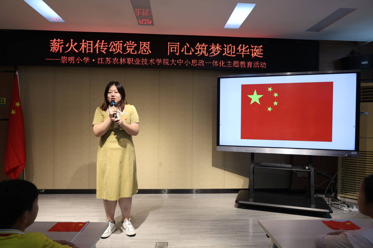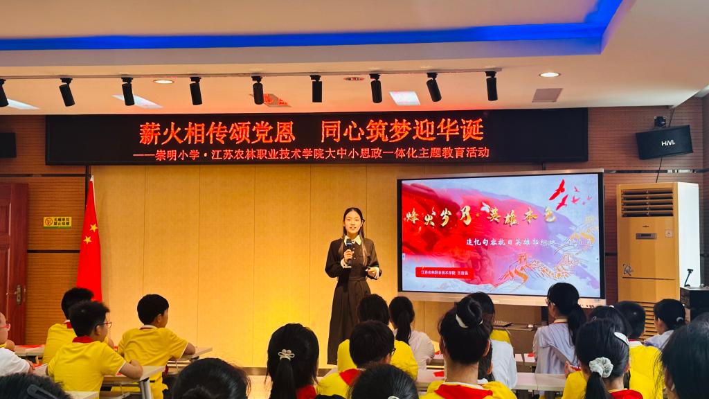活动中,马克思主义学院与崇明小学四位师生代表分别讲述了《党建引领结出“幸福果”》《烽火岁月英雄本色——追忆句容英烈郭纲琳、巫恒通》《铭记历史缅怀先烈 珍爱和平开创未来》以及《从苦难到辉煌:我们的国旗为什么这样红》四个主题内容。从童真视角的幸福感悟,到青春昂扬的英雄礼赞,从教师群体的历史警示,到专家学者的深度解读,不同学段的讲述层层递进,深刻阐释了在中国共产党领导下,中国从苦难走向辉煌的伟大历程,教育引导青少年要铭记历史、开创未来,勇担民族复兴的时代大任。最后,全场师生起立,齐声宣读奋斗誓言,活动在慷慨激昂的氛围中圆满结束。