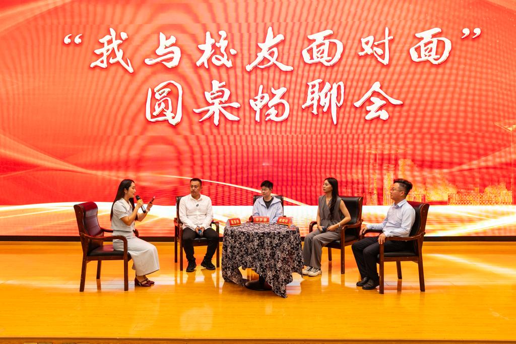 第二环节“我与校友面对面”圆桌畅聊会。四位校友依次结合自身经历,分享职业发展关键节点。校友们聚焦“现代农业发展趋势与职业机遇”“农业创新创业的挑战与应对策略”“农村基层工作实践与成长感悟”三大主题展开深入交流。在互动环节中,现场同学踊跃提问,如“创业启动资源获取”“定制新农干岗位能力要求”“专业知识实践应用”等问题,校友们结合实践自己的经历给同学们提出了针对性建议,互动氛围热烈。