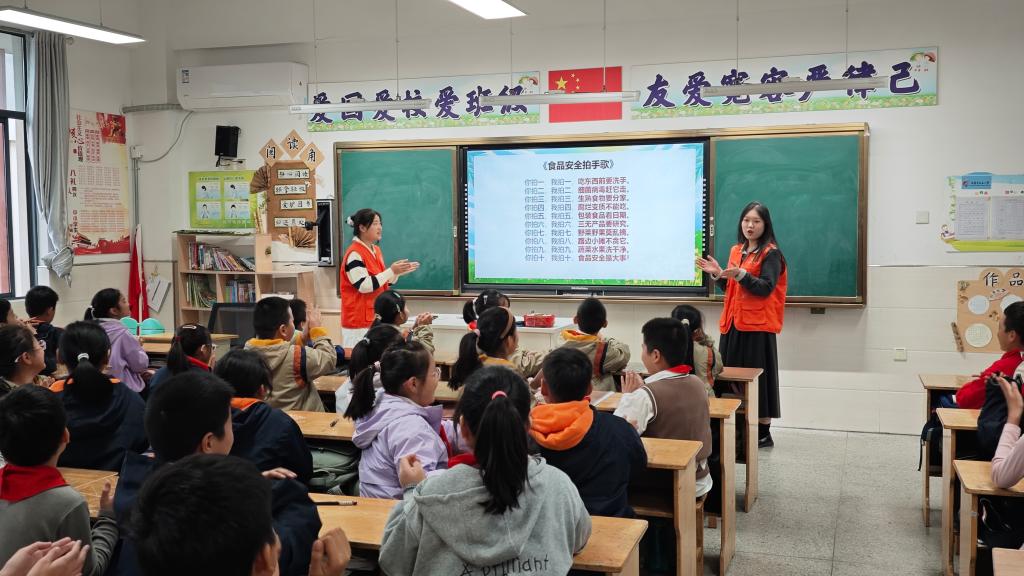 活动中,食品专业曹淼老师给同学们带来了一场生动有趣的食品安全知识讲座,包括食安知识我知道、危害因素我了解、良好习惯我做好、食安儿歌我会唱等方面,帮助学生树立正确的食品安全意识,养成良好的食品卫生习惯。志愿者带领同学们合做“七步洗手法”、合唱“食品安全拍手歌”等,加深同学们对食品安全知识的理解和记忆,现场气氛热烈。